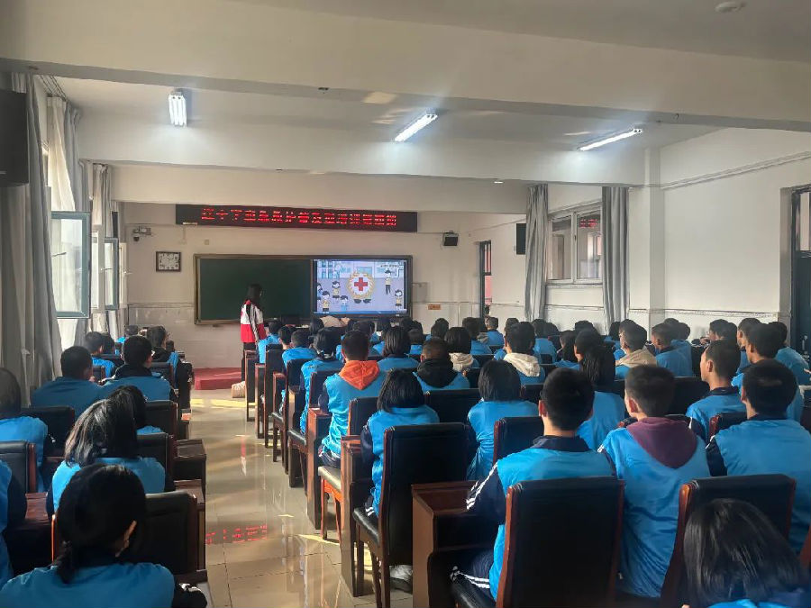 活动前期,红十字会工作人员准备了日常急救知识问答环节,增进了与学生之间的关系,并利用教室电子屏幕播放“救在身边心肺复苏”宣传动画片,活跃现场氛围,提高了学生对急救知识的兴趣。