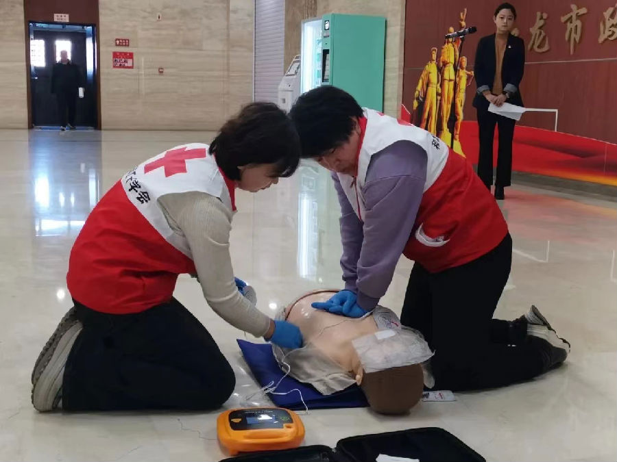 和龙市政府副市长李莲淑出席仪式并致辞。仪式结束后,红十字志愿者还在现场演示了AED使用方法,并进行了心肺复苏技能操作演练。
