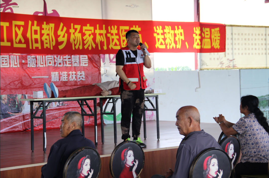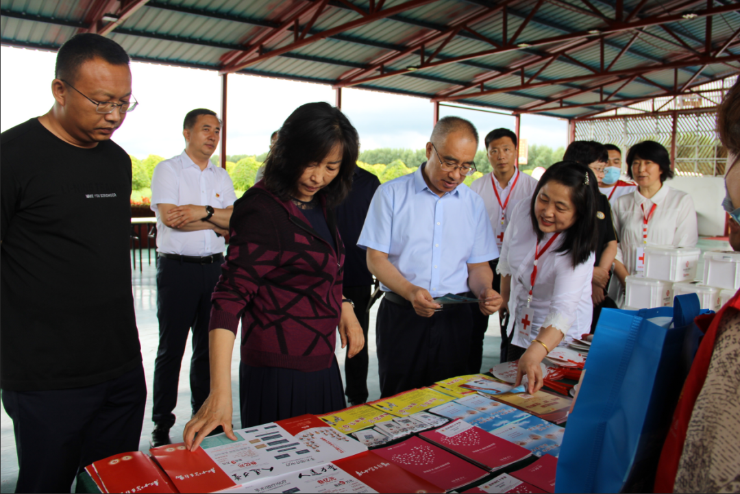 在宁江区伯都乡杨家村,调研组一行观摩了松原市红十字会与宁江区红十字会携手开展的情暖松原·博爱大篷车驶入宁江区伯都乡杨家村活动。现场设立送医、送药、送救护、送温暖四个展区。繁荣社区医院医生为村民义诊,并根据村民身体症状为村民发放步长药业捐赠的常用药品。应急救护培训师向村民普及应急救护、逃生避险知识,传授心肺复苏等应急救护技能。工作人员和志愿者向村民详细讲解了红十字惠民政策和情暖松原·AED“救”在身边活动,并为村民发放保温杯、红十字药箱等纪念品。