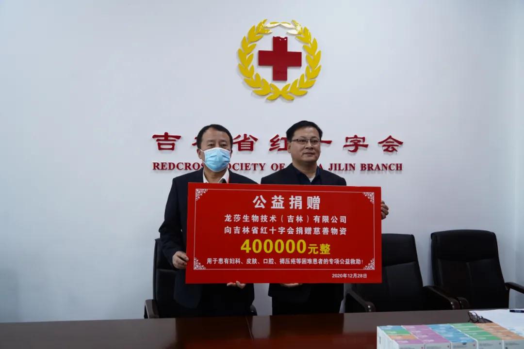 2020年12月28日,龙莎生物技术(吉林)有限公司向吉林省红十字会捐赠40万元的医疗产品,专项用于患有妇科疾病、皮肤病、口腔疾病等经济困难的人群使用。这是龙莎生物第二次通过吉林省红十字会这一爱心平台进行捐赠。