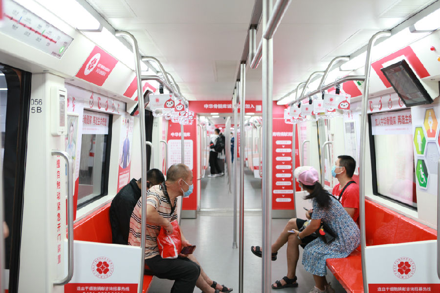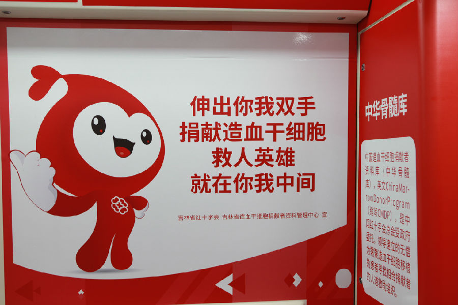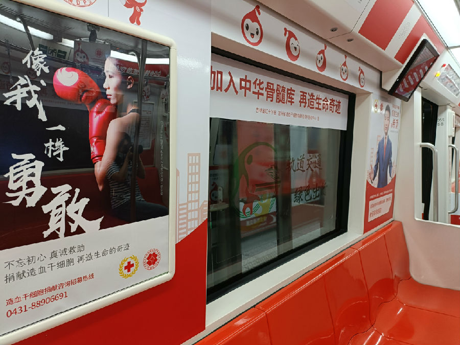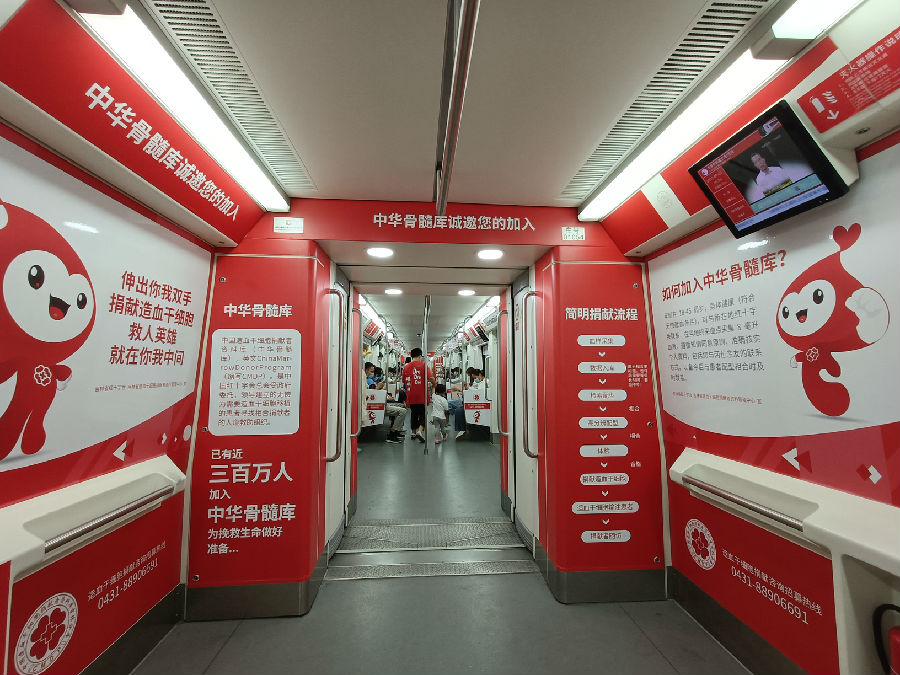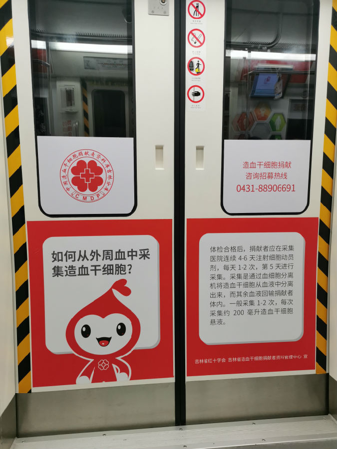 两列载满爱与希望的主题列车,运营线路为长春市地铁一号线,纵贯春城南北。列车的车厢内部以骨髓库爱心宝贝卡通图像、造血干细胞捐献知识、宣传海报等要素装扮。