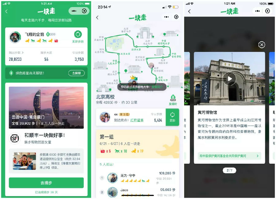 • 企业(团体)通过专属的微信小程序“一块走”,可以自己设计行走地图,定制企业品牌地标,让运动捐步更加适合公司团建,更好地管理爱心行走成员,打造爱心跑团,一边运动,一边捐赠爱心,让公益更日常更有趣!