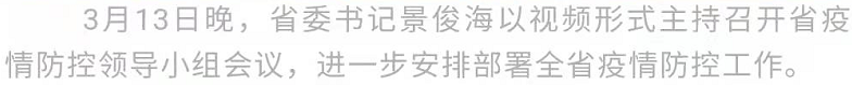 3月13日,省委书记景俊海连夜主持召开省疫情防控领导小组会议。他强调,要深入贯彻习近平总书记关于疫情防控工作的重要讲话重要指示精神,按照孙春兰副总理调研部署要求,坚持把疫情防控作为当前头等大事,坚决把应检尽检、应隔尽隔、应治尽治、应管尽管要求落到实处,以非同寻常举措坚决遏制住疫情传播。省委副书记、省长韩俊出席会议。