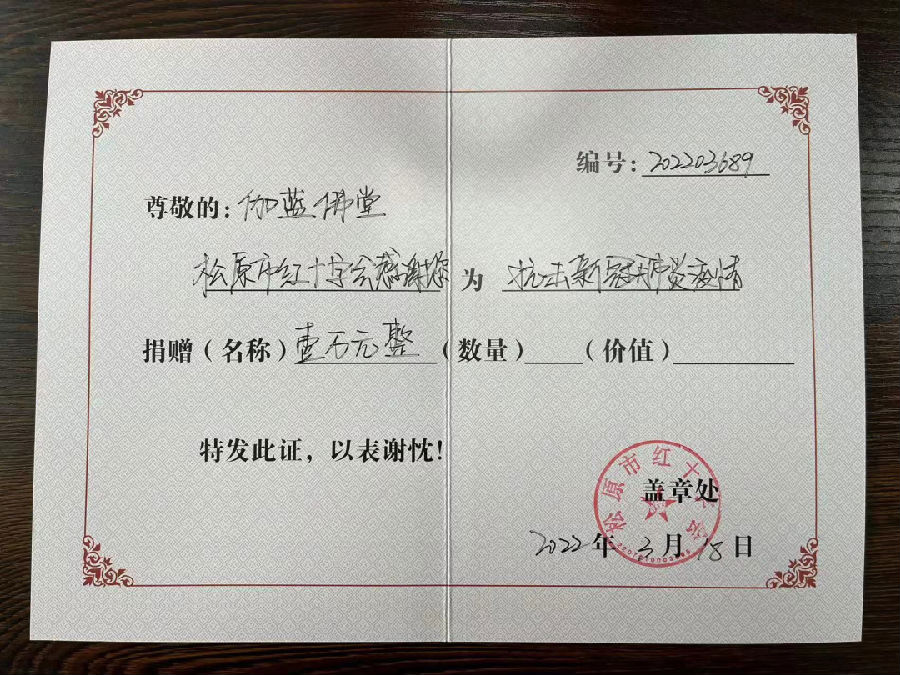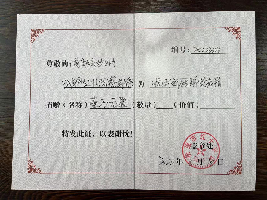 3月18日,前郭县妙因寺、松原市伽蓝佛堂通过银行转账方式向松原市红十字会各捐赠1万元,用于支持松原市疫情防控工作。