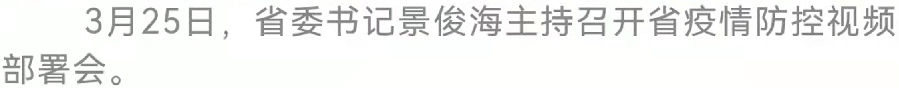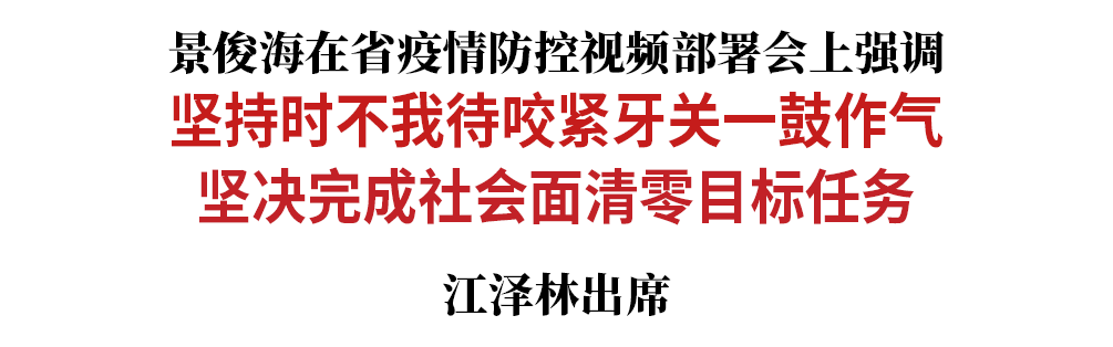 今天(3月25日),省委书记景俊海主持召开省疫情防控视频部署会。他强调,要深入贯彻习近平总书记关于疫情防控的重要指示精神,按照孙春兰副总理部署要求,坚持时不我待、咬紧牙关、一鼓作气,坚决完成社会面清零目标任务,努力在这场大战大考中夺取全面胜利。省政协主席江泽林出席会议。
