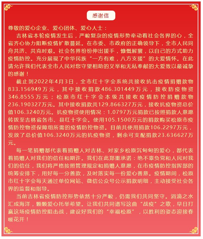 松原市红十字会致社会爱心捐赠人士感谢信。并此承诺,绝不辜负党和人民的信任,将严格按照管理规定和捐赠人意愿,在松原市疫情防控指挥部的统筹安排下,用好每一份善款,及时落实每一份爱心善意。