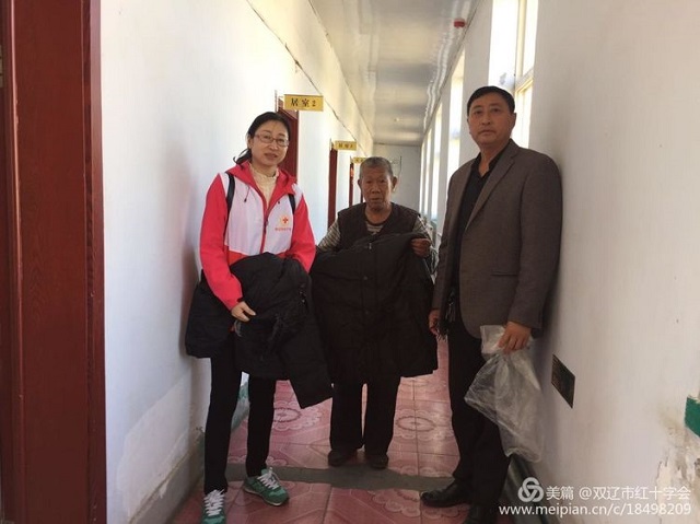 同时红十字会还为福利中心的20位孤寡老人送去20件棉衣。