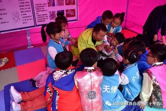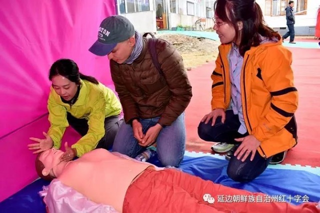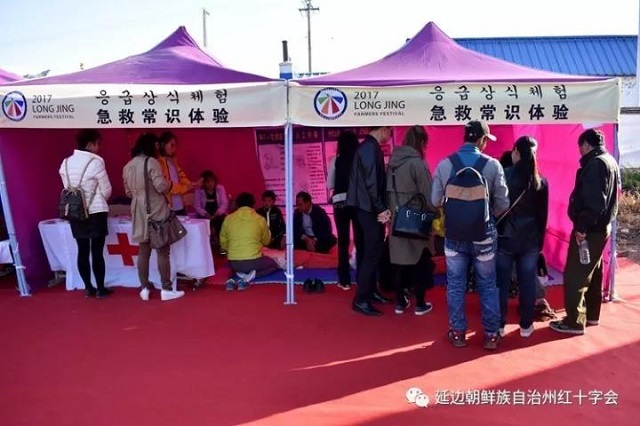10月1日—10月3日,在国庆节旅游高峰期期间,龙井市红十字会职工及红十字志愿者自觉放弃国庆长假,连续3天在游客密集的东盛涌镇仁化村“朝鲜族农夫节”旅游区域,为来往旅客讲解红十字应急救护知识。