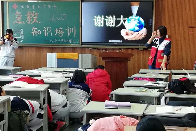 长春红十字救护师资志愿者闫立辉老师为同学们讲解了《地震的防范和自救》,切入巧妙,内容全面。在课程最后,与同学们进行了现场模拟互动。