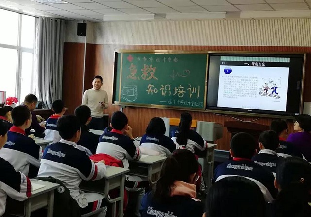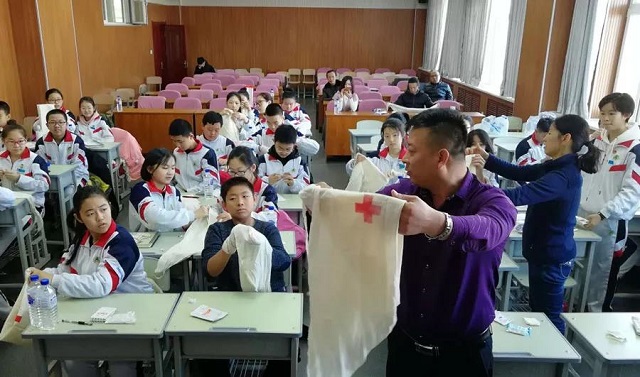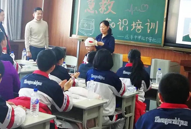 长春红十字应急救护师资志愿者走进吉林省第二实验中学远洋校区,为该校红十字社团开展了救护安全知识讲座,60名红十字青少年及其家长参与了培训。