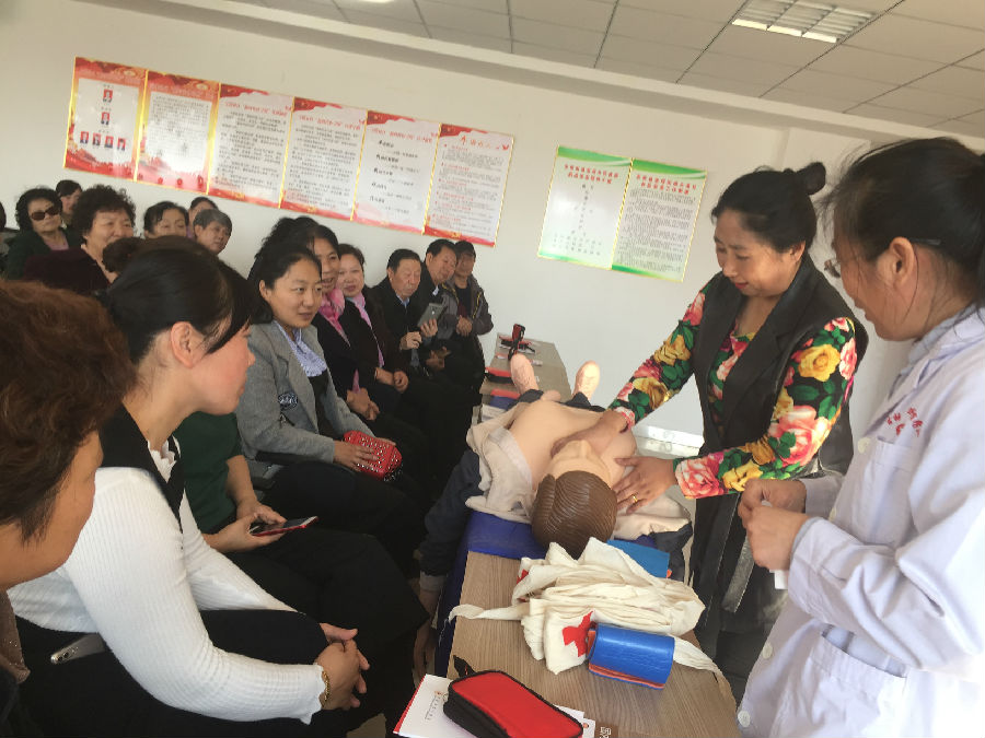 红十字培训师现场详细讲解了心肺复苏和创伤救护的基本知识,利用模拟人进行现场演示,并邀请社区居民参与现场演练,指导他们正确掌握按压手法、深度及频率等技术,居民积极参与现场演练,培训活动气氛活跃。培训师强调要抓住“院前抢救”4分钟救命黄金时刻,开展有效地自救互救,挽救生命、降低病死率,最大限度保护人的生命和健康。为提高培训效果,县红十字会向每位居民发放了急救包、《应急救护手册》和《红十字会在行动手册》。借助应急救护培训的平台向广大居民宣传省红十字会肿瘤救助项目,弘扬人道力量广泛开展对肿瘤患者的救助。