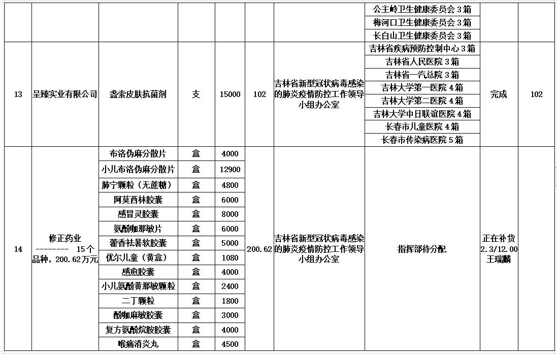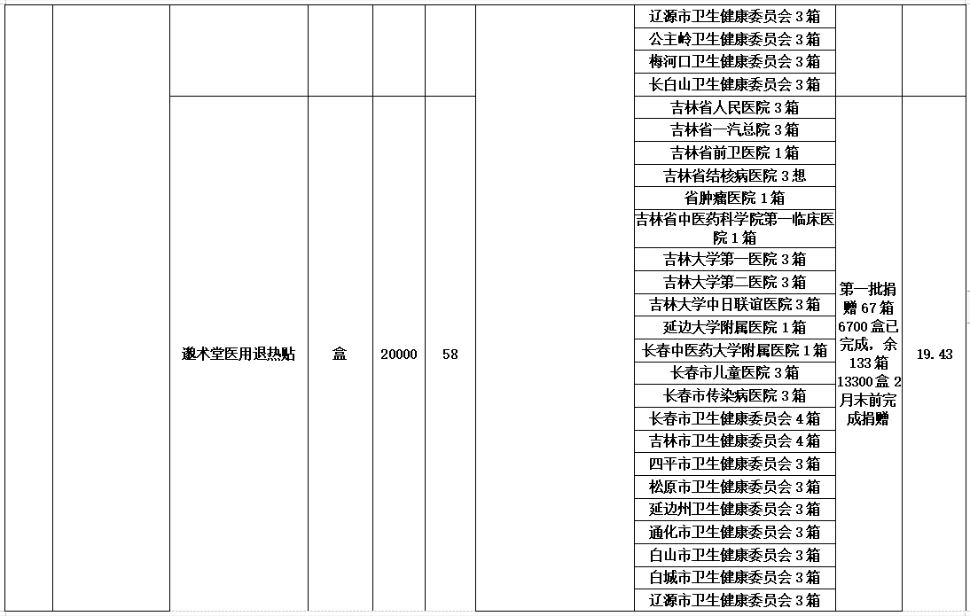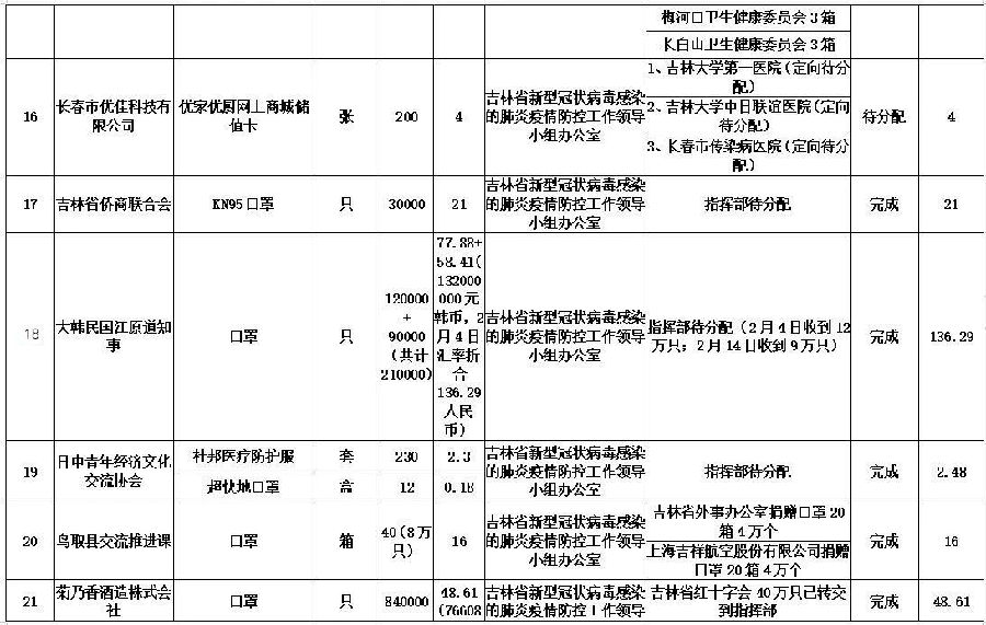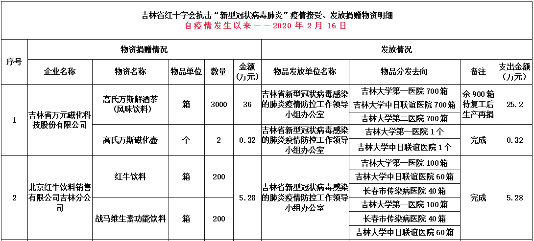 自新型冠状病毒肺炎疫情发生以来,截止2020年2月16日14时,全省红十字会系统共接受社会爱心企业、爱心人士捐赠抗击疫情款物13219.18537万元。吉林省红十字会本级接受抗击疫情款物1694.04万元,其中:接受捐赠资金248.15万元,支出捐赠资金181.01万元(已汇入武汉市红十字会);用于吉林省疫情防控捐款58.19万元,其余8.95万元捐款于近日汇往武汉市红十字会。接受捐赠物资价值1445.89万元,支出捐赠物资价值1165.95万元(用于武汉和吉林省疫情防控),其余捐赠物资均由吉林省疫情防控领导小组相关部门统一调配。