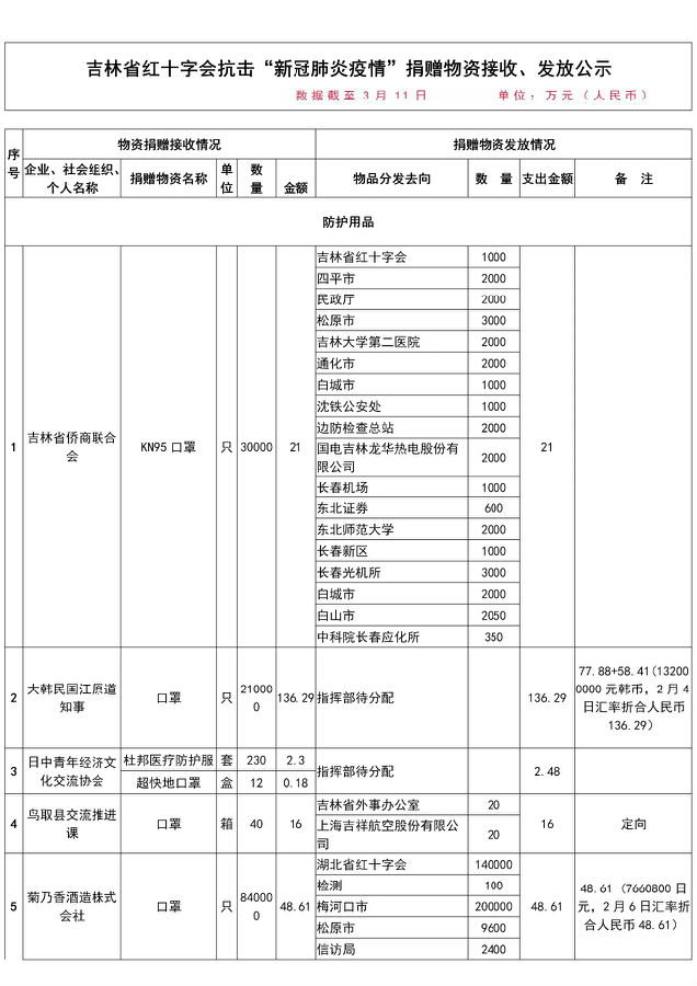 具体社会捐赠款物接收与支出明细可在吉林省民政厅、吉林省红十字会官网查阅。各市(州)红十字会社会捐赠款物接收与支出情况,详见各地公告。