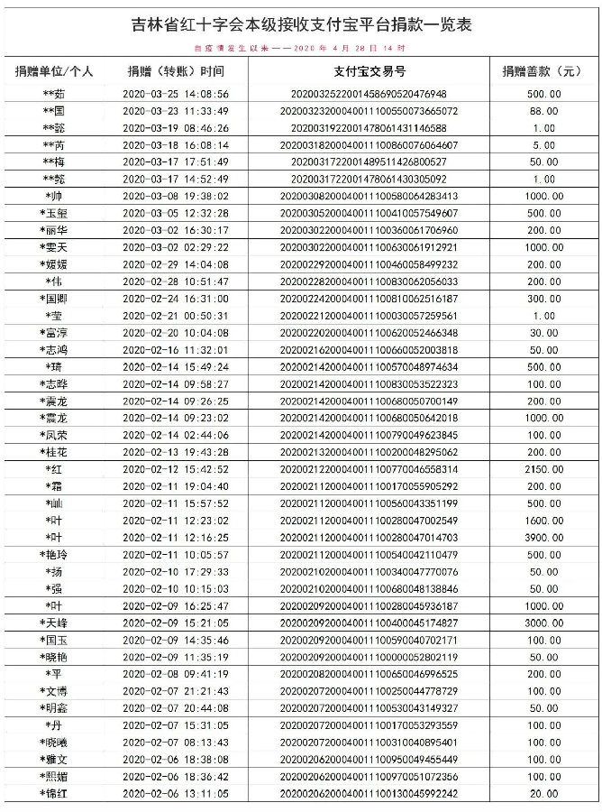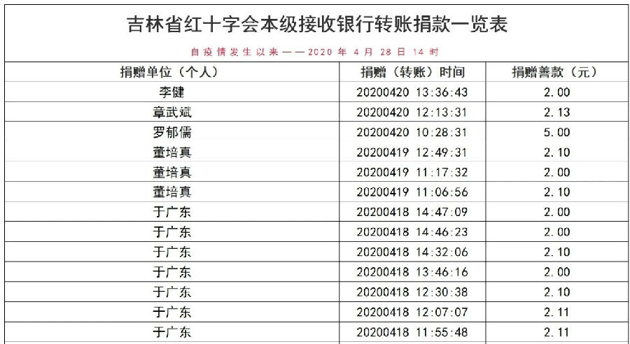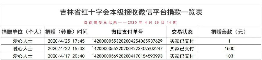 下一篇: 【捐赠公示】吉林省红十字会接受社会捐赠一览表(疫情发生以来—2020年4月21日14时)