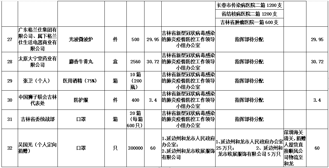 自新型冠状病毒肺炎疫情发生以来,截止2020年2月16日14时,全省红十字会系统共接受社会爱心企业、爱心人士捐赠抗击疫情款物13219.18537万元。吉林省红十字会本级接受抗击疫情款物1694.04万元,其中:接受捐赠资金248.15万元,支出捐赠资金181.01万元(已汇入武汉市红十字会);用于吉林省疫情防控捐款58.19万元,其余8.95万元捐款于近日汇往武汉市红十字会。接受捐赠物资价值1445.89万元,支出捐赠物资价值1165.95万元(用于武汉和吉林省疫情防控),其余捐赠物资均由吉林省疫情防控领导小组相关部门统一调配。