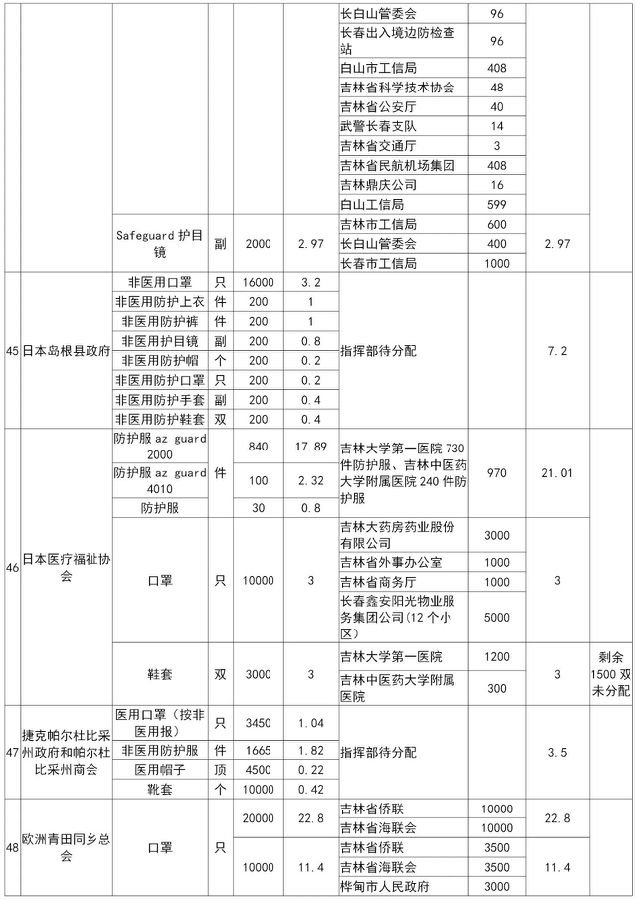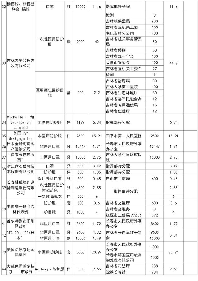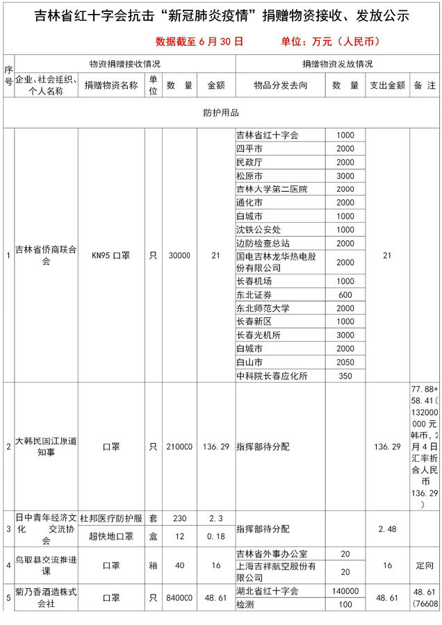 省红十字会本级接收捐赠物资价值人民币4519.4万元,捐赠物资由吉林省疫情防控领导小组统一调配支出。