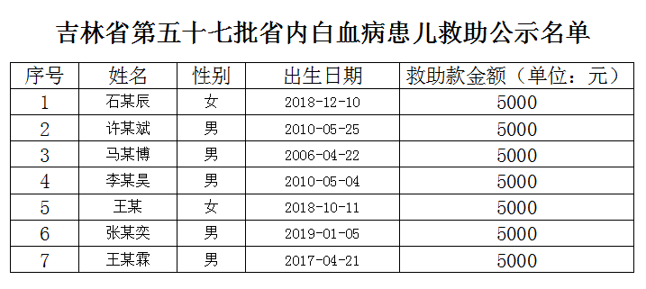 吉林省第五十七批省内白血病患儿救助公示名单