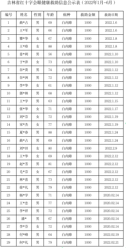 吉林省红十字会眼健康救助基金项目救助公示 (2021年1月至6月)