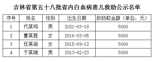 吉林省第五十八批省内白血病患儿救助公示名单
