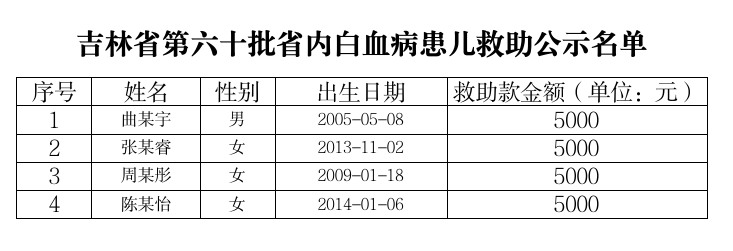 吉林省第六十批省内白血病患儿救助公示名单