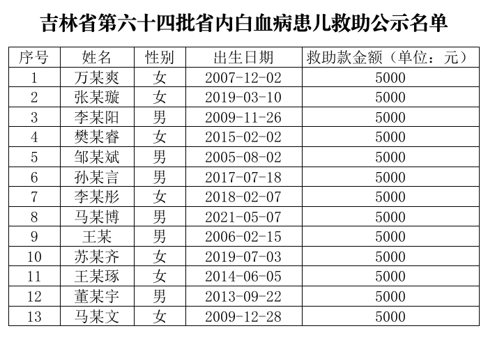 吉林省第六十四批省内白血病患儿救助公示名单