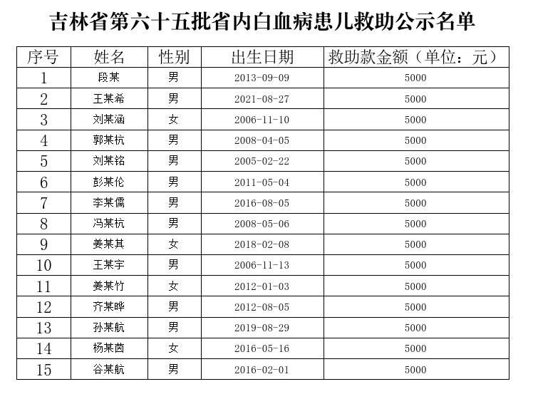吉林省第六十五批省内白血病患儿救助公示名单