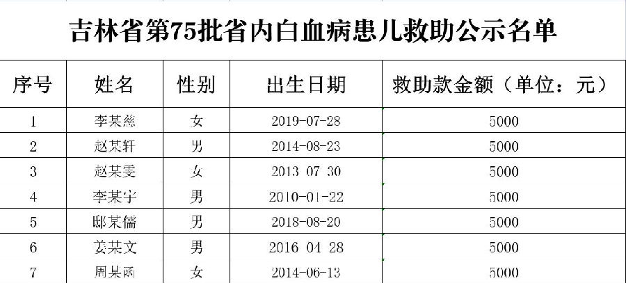 中华骨髓库对吉林省造血干细胞捐献者代宏宇、郭东革、刘天龙、李云峰、王松、王宇飞同志进行人道主义救助的公示