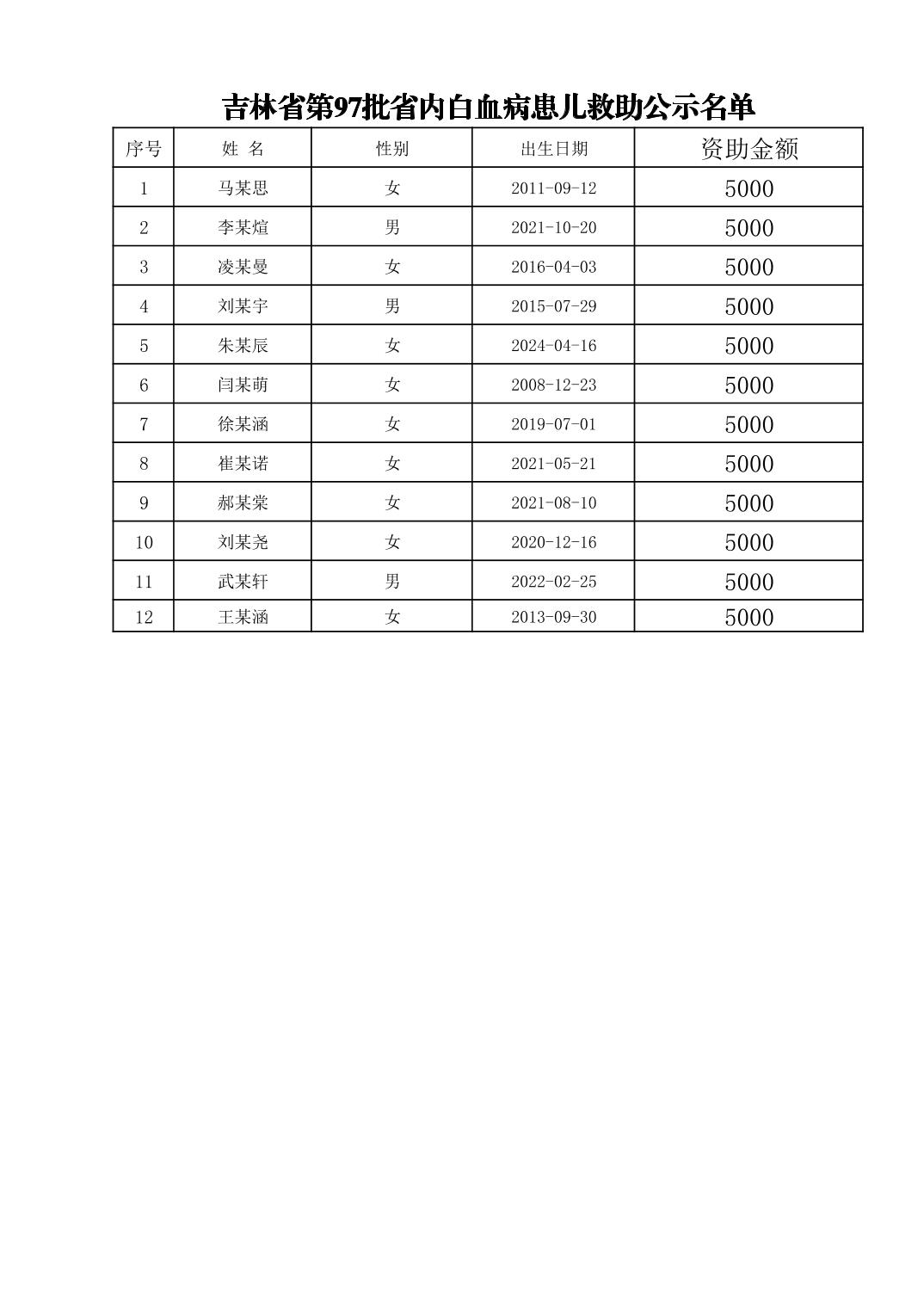 吉林省第97批省内白血病患儿救助公示名单