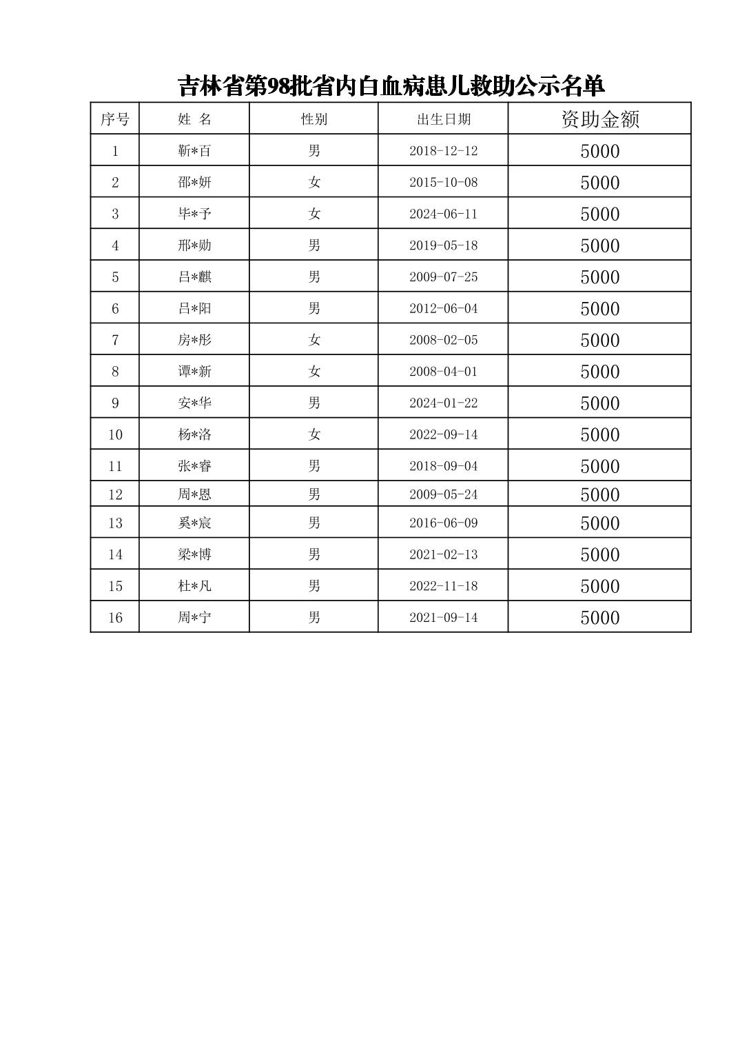 吉林省第98批省内白血病患儿救助公示名单