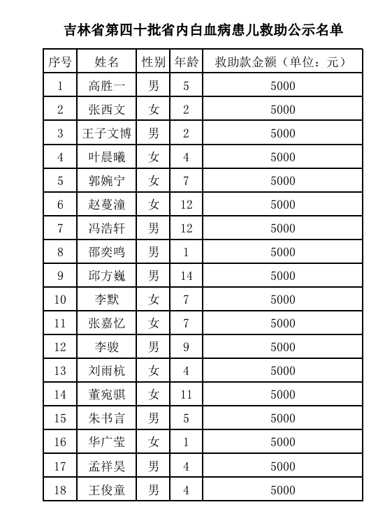 吉林省第四十批省内白血病患儿救助公示名单