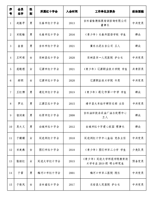 为推进红十字会组织体系建设,不断夯实红十字事业发展基础,充分发挥会员在红十字事业发展中的主体作用,激发会员参与和支持红十字事业的热情,增强会员的归属感、荣誉感,努力营造会员积极参与和推动红十字事业的良好环境,根据《中国红十字会总会关于组织开展中国红十字会“会员之星”推选活动的通知》,拟推选对象经自下而上逐级推选、审核把关,现确定吉林省红十字会正式推选对象为以下15名会员。即日起,推选名单将在省红十字会官方网站公示5个工作日,经公示无异议的,报送中国红十字会总会。