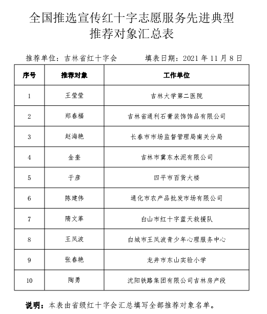 根据中国十字会总会《关于开展全国推选宣传红十字志愿服务先进典型活动的通知》要求,吉林省红十字会在广泛征求意见的基础上,按照推荐条件层层择优推荐,经研究,现将推荐对象公示如下: