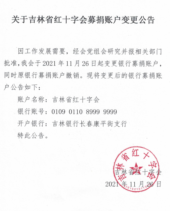 关于吉林省红十字会募捐账户变更公告