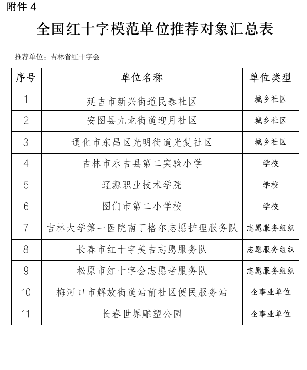 根据中国红十字会总会办公室《关于组织开展全国红十字模范单位推荐评选表彰工作的通知》(中红办字〔2022〕35号)精神,通过自下而上推荐,并经吉林省红十字会党组会议研究审议,拟推荐下列3个社区、3个学校、4个志愿服务组织、1个企业作为表彰对象,现予公示,公示时间为5个工作日,公示日期为:2022年8月22日至8月26日。公示期间,如有对推选对象提出异议的,由相关市级红十字会调查核实,情况属实的,取消该推选对象推选资格,并不再递补名额。经公示无异议的,报送中国红十字会总会。吉林省红十字会组宣部电话:0431-88906991