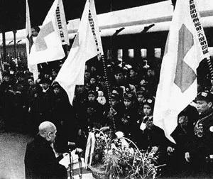 左图:1950年10月16日至21日,中国红十字会长李德全(左一)、常务理事伍云甫(中)出席国际红十字协会第21届理事会;右图:抗美援朝时,中国红十字会医防救护人员光荣赴朝。
