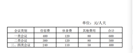 第十五条 培训费管理。培训须按照会党组确定的培训计划召开,会议举办地点原则上在政府定点宾馆召开。会议住宿以标准间为主,用餐安排自助餐,会议不得安排宴请,不得组织旅游及与会议无关的参观、考察活动,不得以任何名义发放纪念品,各部举办的培训,住宿费每人每天240元,伙食费每人每天110元,场地租金、资料、参加培训人员交通费每人每天30元,其他费用(含现场教学、设备租赁等与培训有关的其他支出)每人每天20元,可调剂使用。