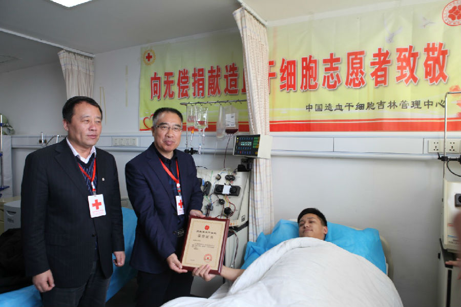 2019年12月16日,伴随着血液分离机的运转,殷红的造血干细胞悬混液不断分离出来,生命的种子将及时送往患者移植的医院。张学文成为我省第83例(全国第9257例)造血干细胞捐献者。吉林省红十字会党组书记、常务副会长牛继东,吉林省红十字会党组成员、副会长于立敏亲赴医院慰问,并向他颁发了荣誉证书。安图县公安局政治工作室副主任刘义胜、巡警大队队长孟庆鹏在采集当天来医院进行慰问。
