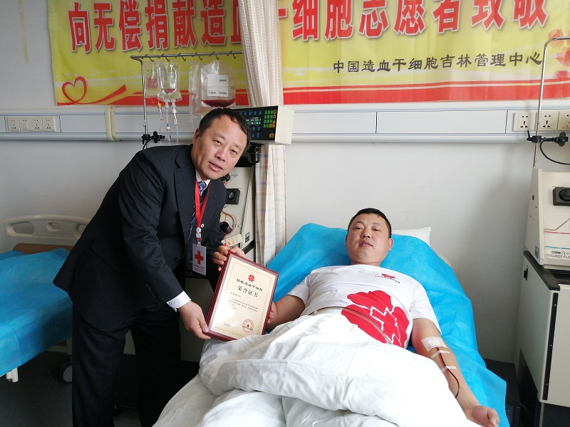 2020年1月8日捐献当天,吉林省红十字会党组成员、副会长于立敏亲赴医院慰问,并为王文龙颁发荣誉证书。这个憨厚朴实的80后成为我省第84例(全国9357例)造血干细胞捐献者,同时也是今年吉林省的第一例捐献者。在新年伊始,就为一位白血病患者送上了一份最珍贵的礼物。