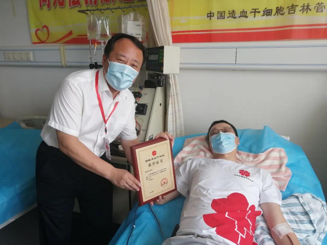 2020年7月6日,来自梅河口市的志愿者李彦霖在吉林大学第一医院为一位白血病患者捐献造血干细胞,成为我省第91例(全国9852例)捐献者。吉林省红十字会党组成员、副会长于立敏,赶赴医院慰问并向李彦霖颁发荣誉证书。