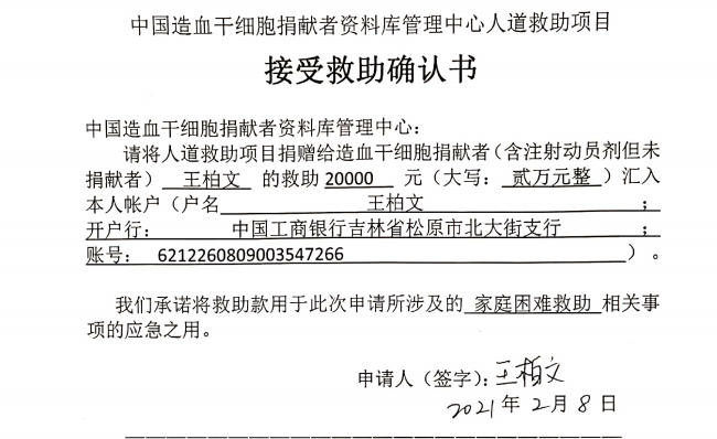 根据红库管字〔2018〕84号文件精神,中华骨髓库兹决定对于吉林省造血干细胞捐献者王柏文同志予以以下救助: