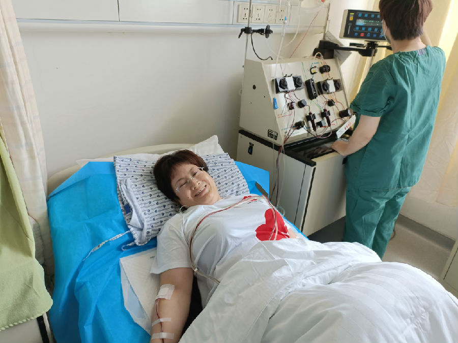 15日上午9时,房铁冰在采集室开始进行造血干细胞采集。深红的血液从她肘部静脉流出,一点一滴收集到储血袋中,汇聚成一股爱的暖流,为素未谋面的血液病患者带去重生的希望。在做完造血干细胞采集之后,房大姐笑呵呵的向我们说道:“目前我整个人的状态都很好,我希望那位陌生的患者能够早日康复,重燃对生活的热爱。我没那么伟大,只是想努力让自己的光照亮更多的人,其实造血干细胞捐献不是那么恐怖的事情,对身体的影响也没有大家想象的那么大,我希望能通过我的亲身经历,让更多的人去了解造血干细胞捐献,去关注它,加入它,让更多的患者感受到生命之光!”房大姐乐观开朗的态度感染着采集室内每一位工作人员。