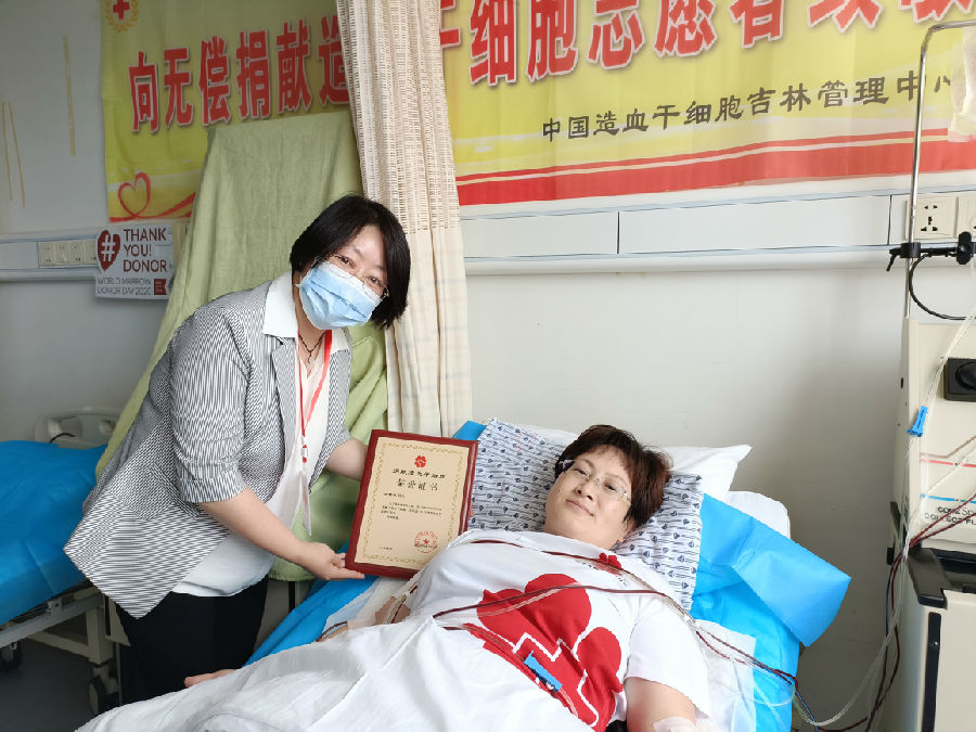 采集当天,中华骨髓库吉林分库负责人刘艳丽,赶赴医院看望慰问房铁冰,并为她颁发了荣誉证书。