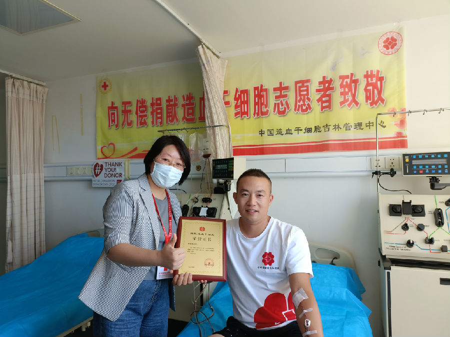 2021年8月30日,吉林省第112例(全国第11901例)造血干细胞捐献者杨海欧在吉林大学第一医院进行了造血干细胞采集。中华骨髓库吉林分库负责人刘艳丽赶赴医院慰问,并向他颁发了荣誉证书。