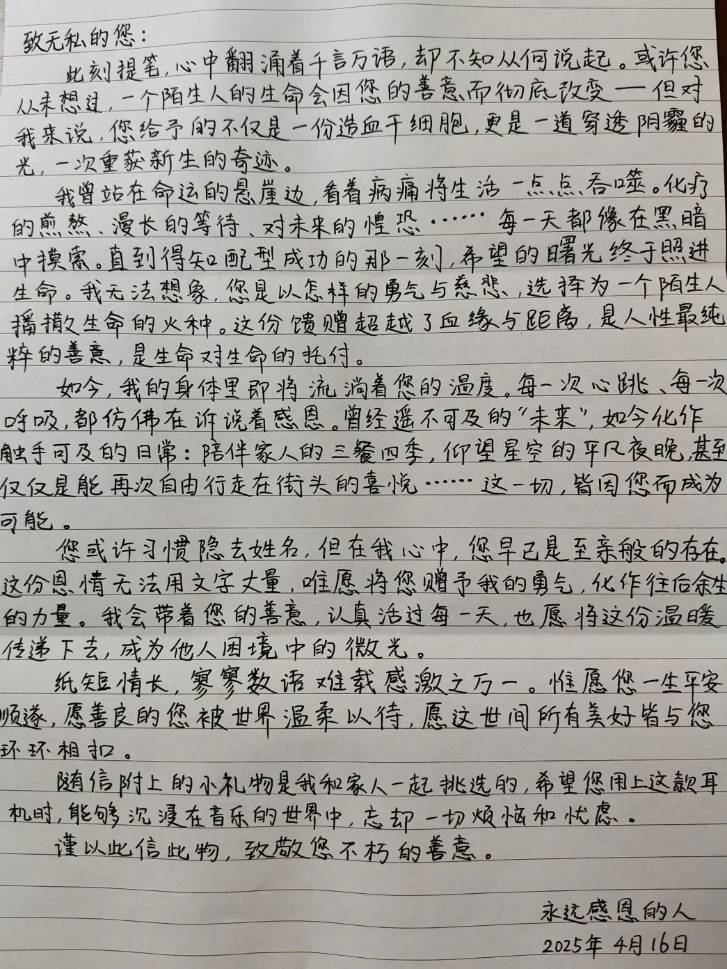 在捐献完成后,他委托护送造血干细胞的志愿者为患者送去祝福: