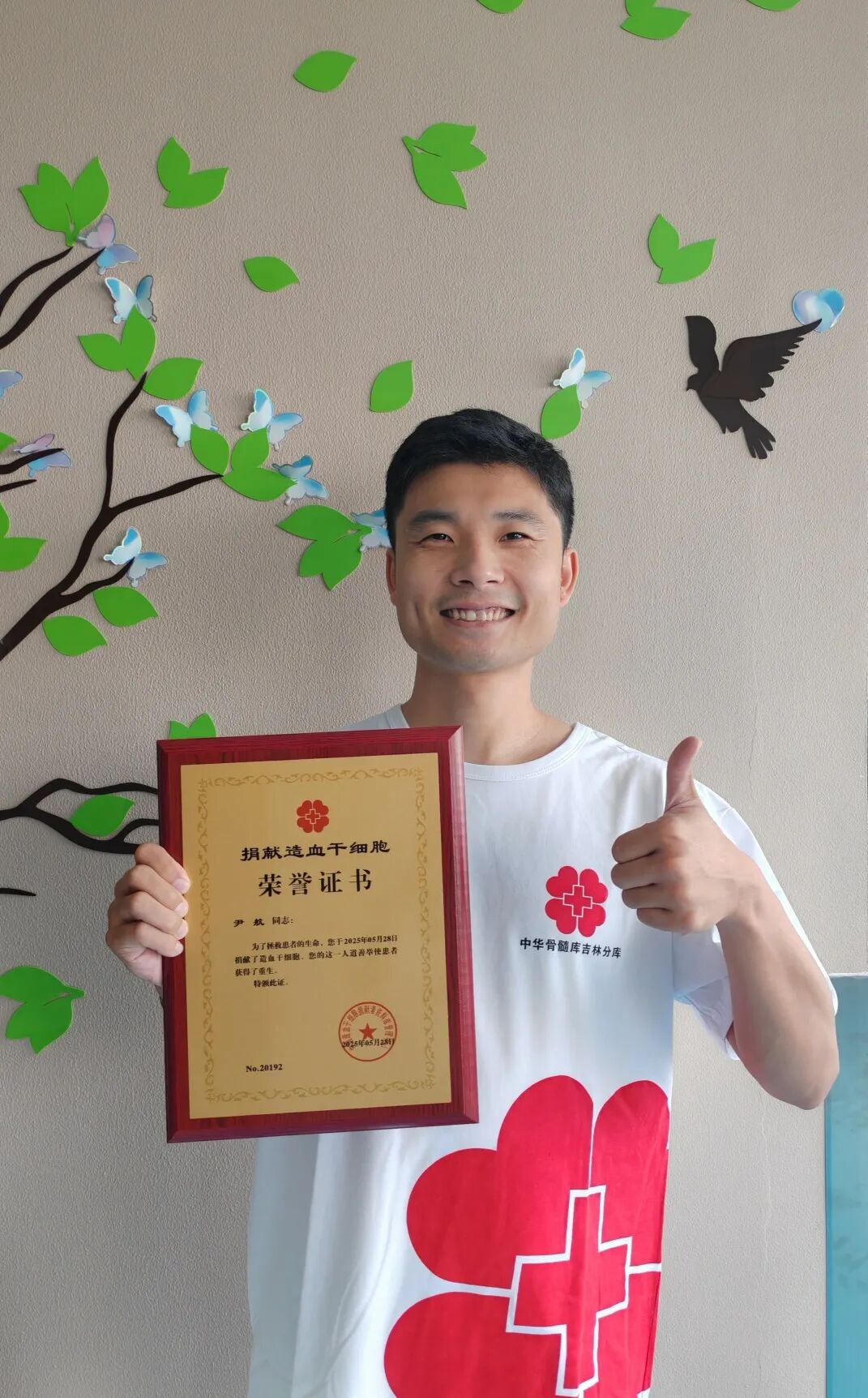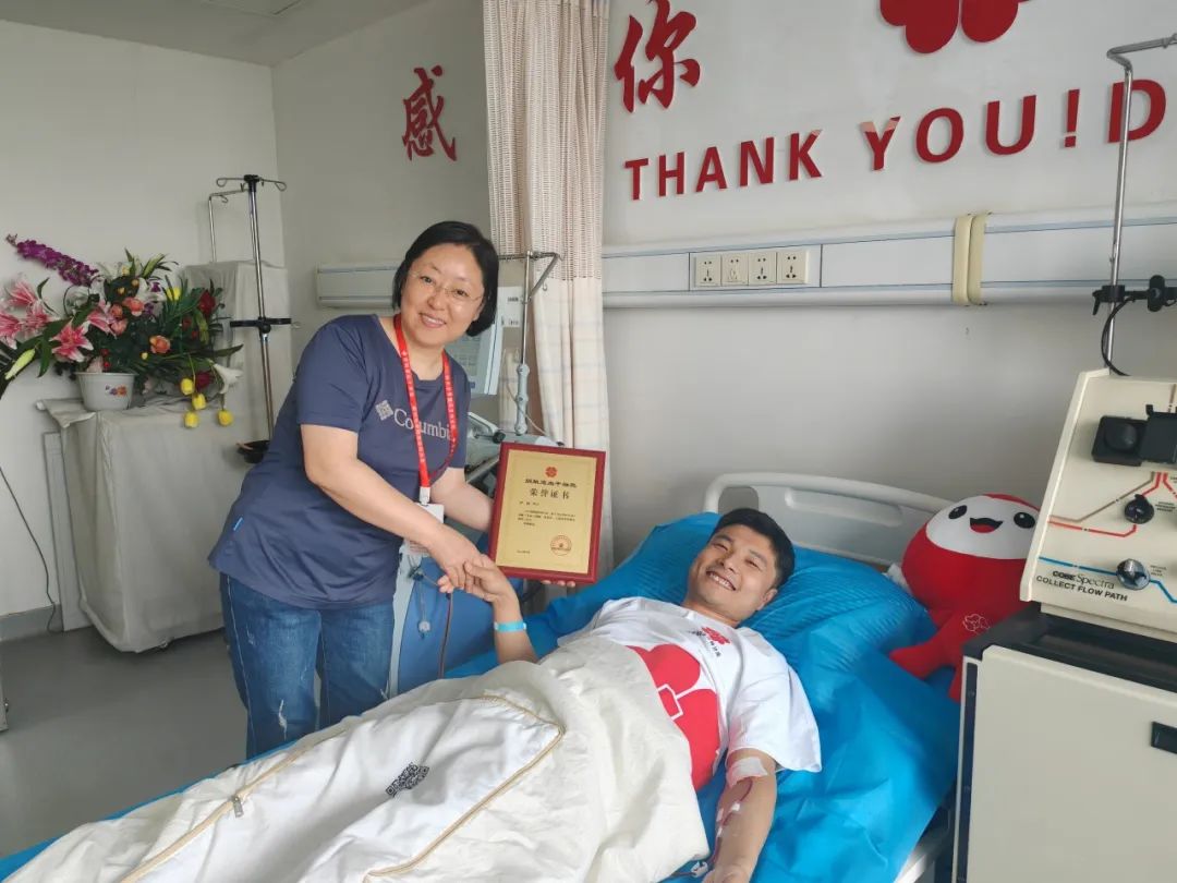5月28日,来自长春市的尹航在吉林大学第一医院成功捐献了造血干细胞,成为吉林省第196例(中华骨髓库第20192例)造血干细胞捐献者。这位6岁孩子的父亲用特殊的方式诠释了父爱与责任,为血液病患者点亮新生希望。采集当天,吉林分库负责人刘艳丽前往现场看望慰问,为他颁发荣誉证书。
