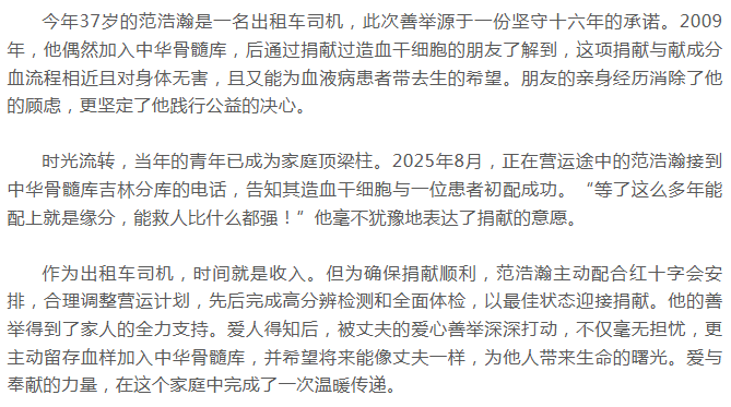 “的哥”大爱 点燃生命之光——吉林省206例造血干细胞捐献者范浩瀚