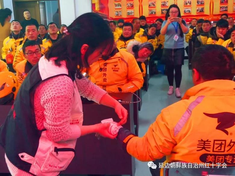 市红十字会朴老师针对美团外卖在送外卖时愿意出现的伤害进行了培训,培训内容主要有如何止血,手背擦伤的包扎、前臂骨折时如何制作大悬带等几个方面进行讲解和演示。在现场朴老师又解答了美团外卖的人员提出的问题,在生活上遇到了脑出血如何处理,脚脖扭伤如何处理,培训过程中,红十字朴老师与美团外卖的工作人员互动交流,通过示范操作和练习,让美团工作人员掌握基本的包扎方法和日常创伤救护知识,并全面的了解了创伤急救知识及技能,使大家受益匪浅。