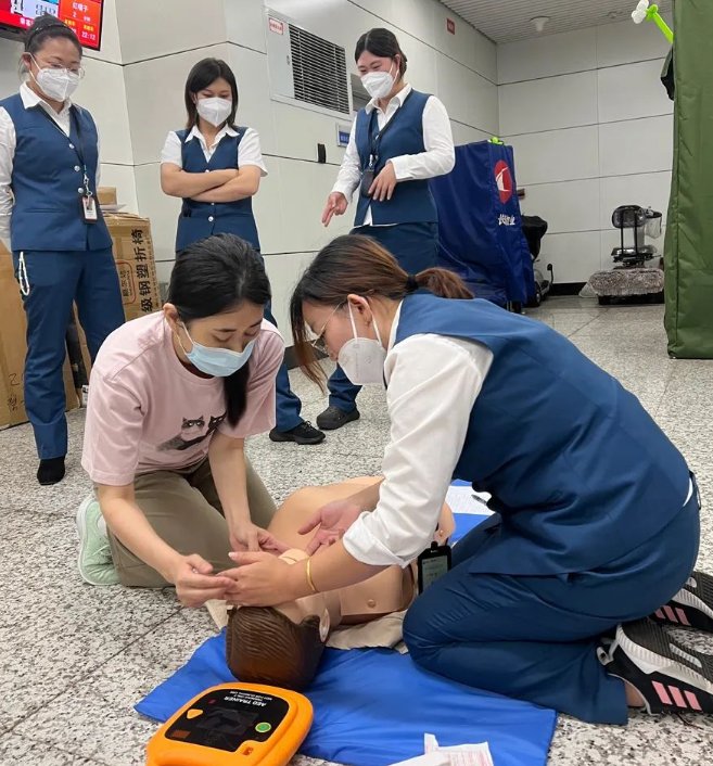 市红十字会在地铁1号线6个安装自动体外除颤器(AED)的站点,对部分站务人员和安保人员进行心肺复苏技术和AED使用的培训,47名一线员工获得心肺复苏(CPR+AED)培训证书。