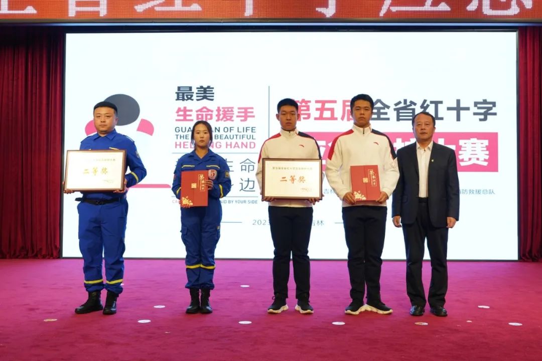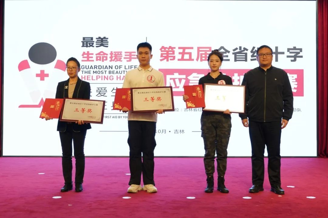 吉林省红十字会党组书记、常务副会长牛继东,原吉林省红十字会党组成员、副会长于立敏,吉林省应急管理厅救援协调和预案管理处一级主任科员黄宇,吉林省消防救援总队职业健康中心助理员毛羽舒为大赛获奖选手颁奖。