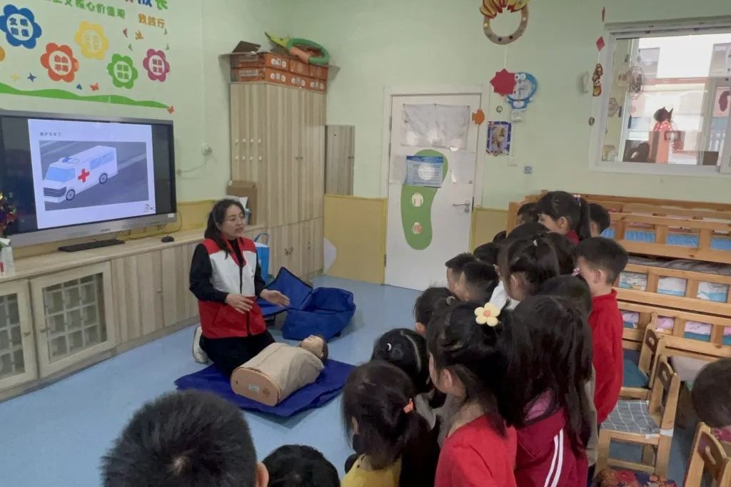 因本次宣传活动的主要对象是幼儿园小朋友和幼师,宣讲老师制作了适合小朋友观看的PPT,以讲故事的方式进行授课,通过图文讲解、现场演示等方式讲述了红十字会的起源、红十字会精神、心肺复苏以及应急避险的知识。并通过人体模型演示介绍了心肺复苏术的整体操作流程:如何检查呼吸、如何打开气道、如何定位按压、如何人工呼吸等等。小朋友都被带入到一场与时间赛跑的急救故事中,非常积极的和宣讲老师互动。